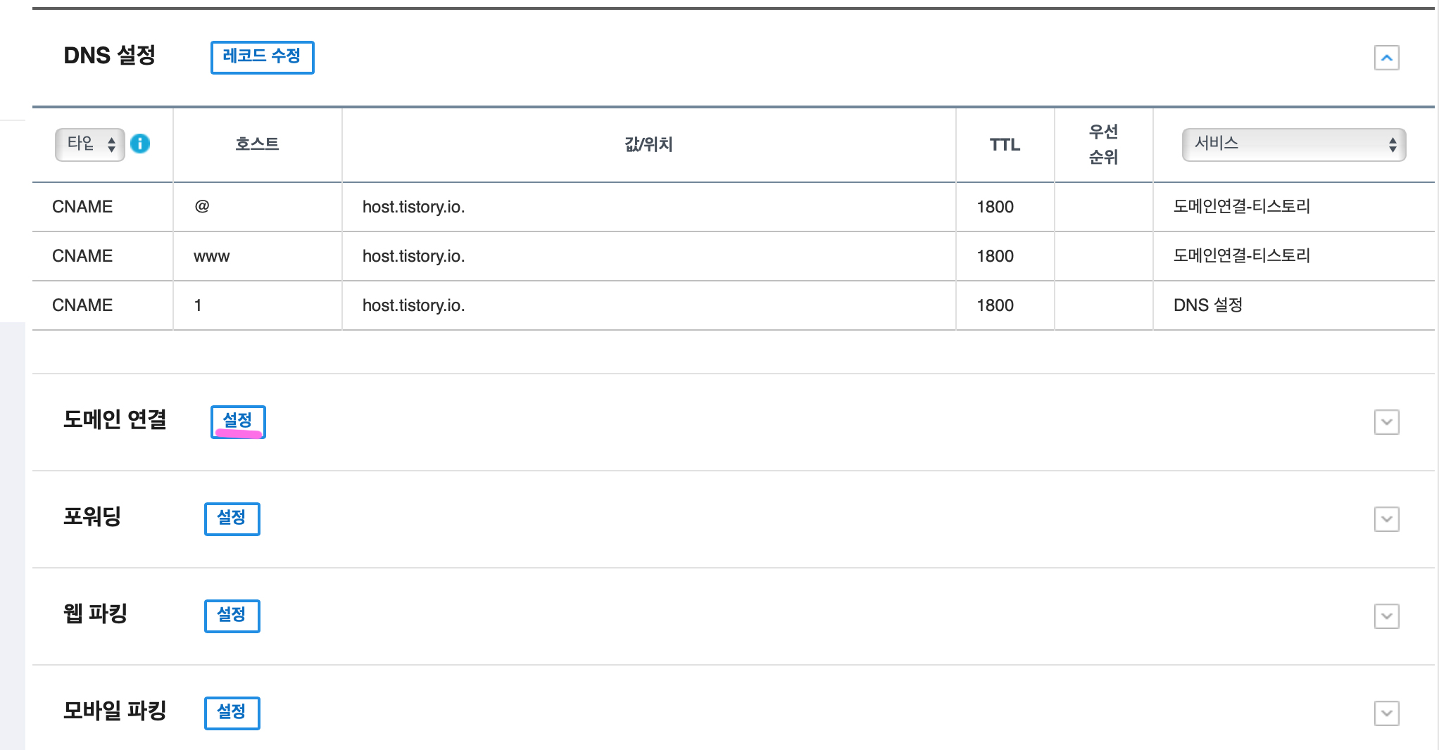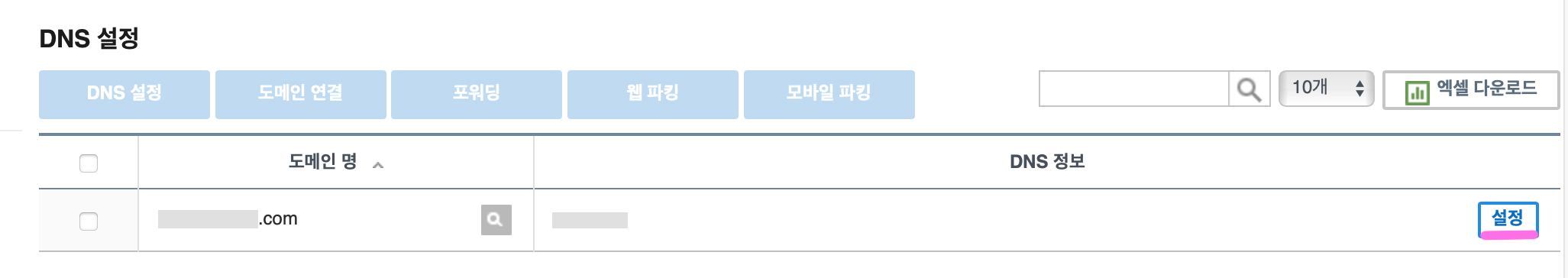 6. 구입이 완료되면 DNS관리툴을 찾아 클릭하고 DNS설정 항목에 있는 자신의 주소 맨 오른쪽에 있는 설정을 클릭한다.