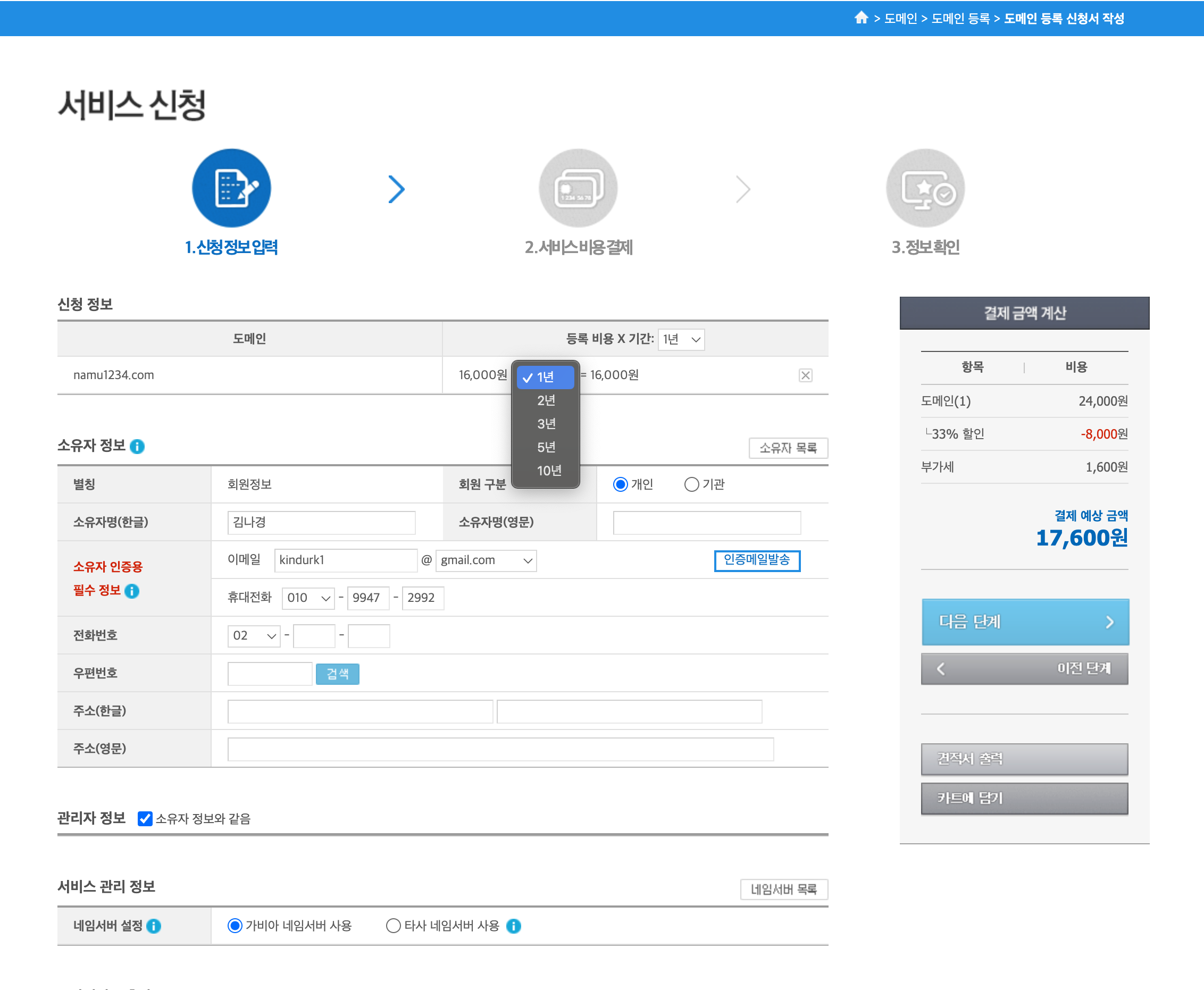 5. 신청 창에 들어오면 도메인 사용기간을 선택할 수 있는데 처음이니 1년 사용해보고 나중에 추가하는 방법을 추천한다. 블로그를 꾸준히 운영하기가 힘들다 보니 1년 후를 장담할 수가 없기 때문이다. ^^ 기타 다른 개인 정보를 모두 입력하고 다음 단계에서 결재를 완료한다.