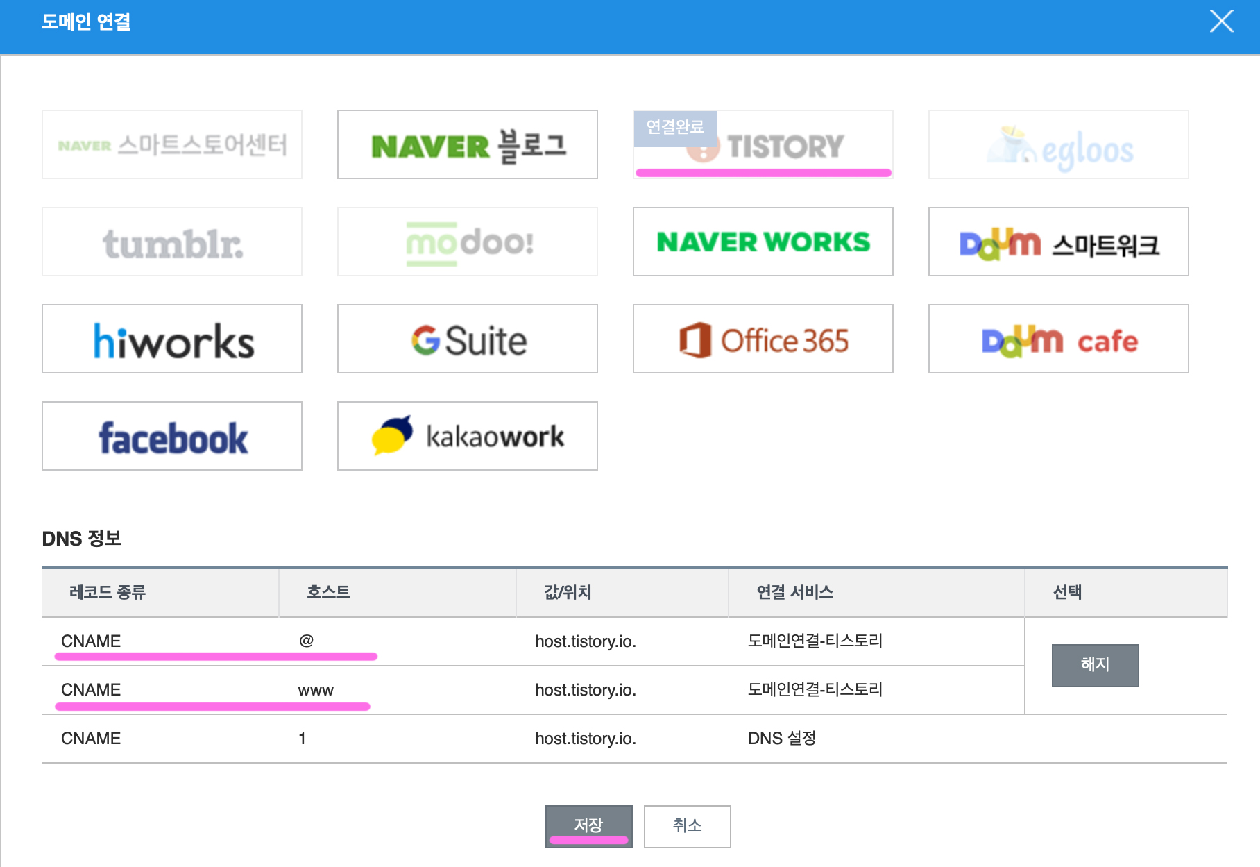 7. 설정 창에서 도메인 연결 설정을 누르면 도메인 연결이 가능한 다양한 블로그와 sns 메뉴가 썸네일로 떠 있으니 그 중 티스토리를 클릭해서 연결해주면 된다.