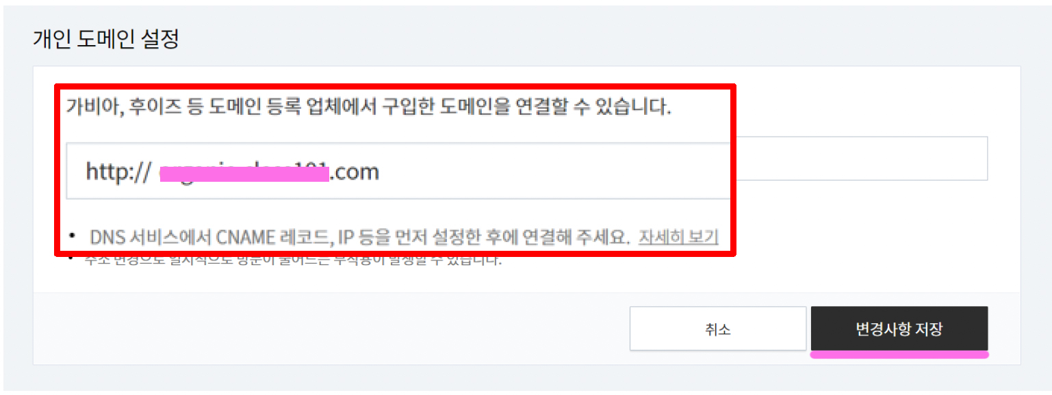 10. 가비아에서 구입한 도메인 주소를 입력하고 변경사항을 저장해주면 도메인이 서로 연결된 것을 확인할 수 있다.