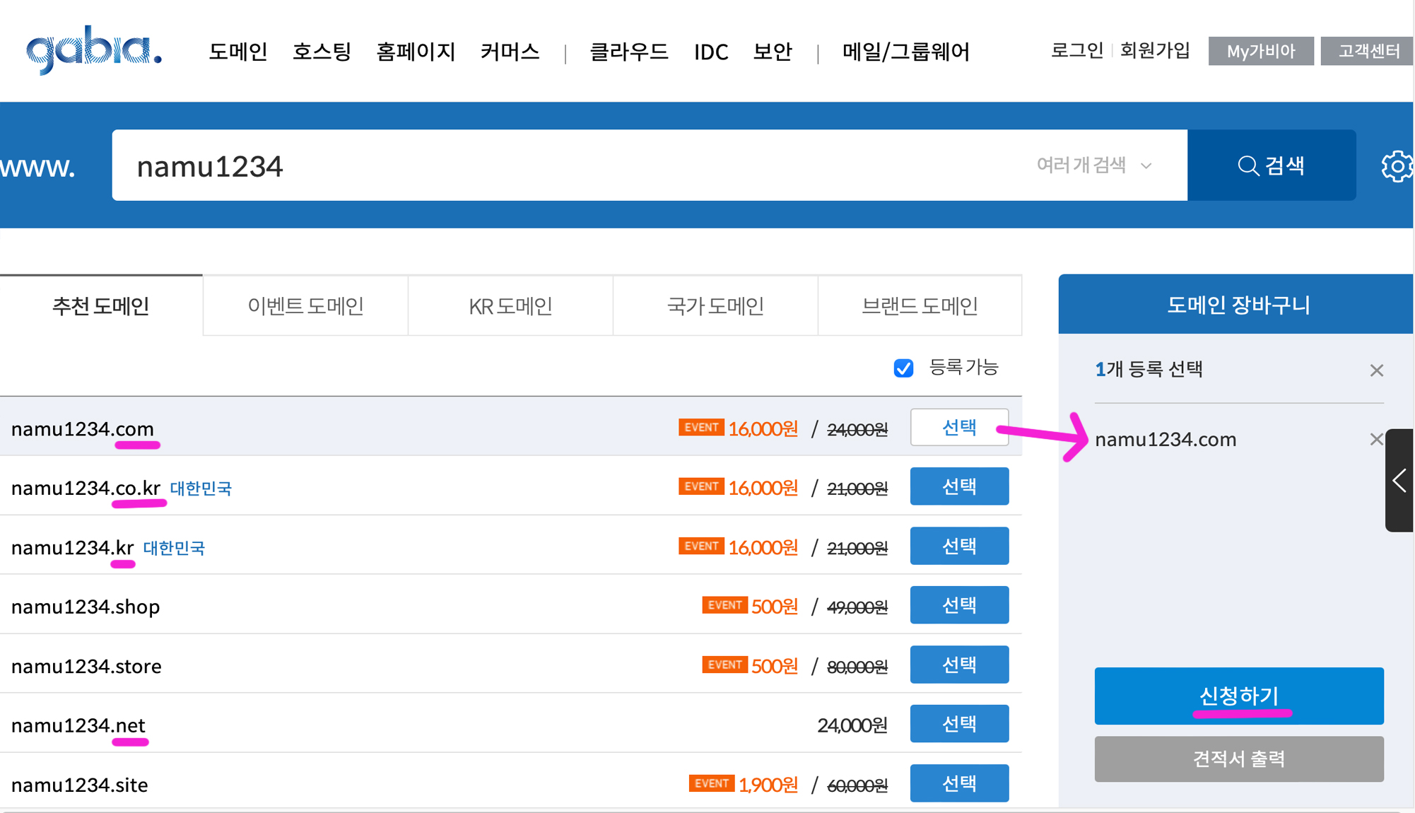 가비아에서 도메인 구입하기
