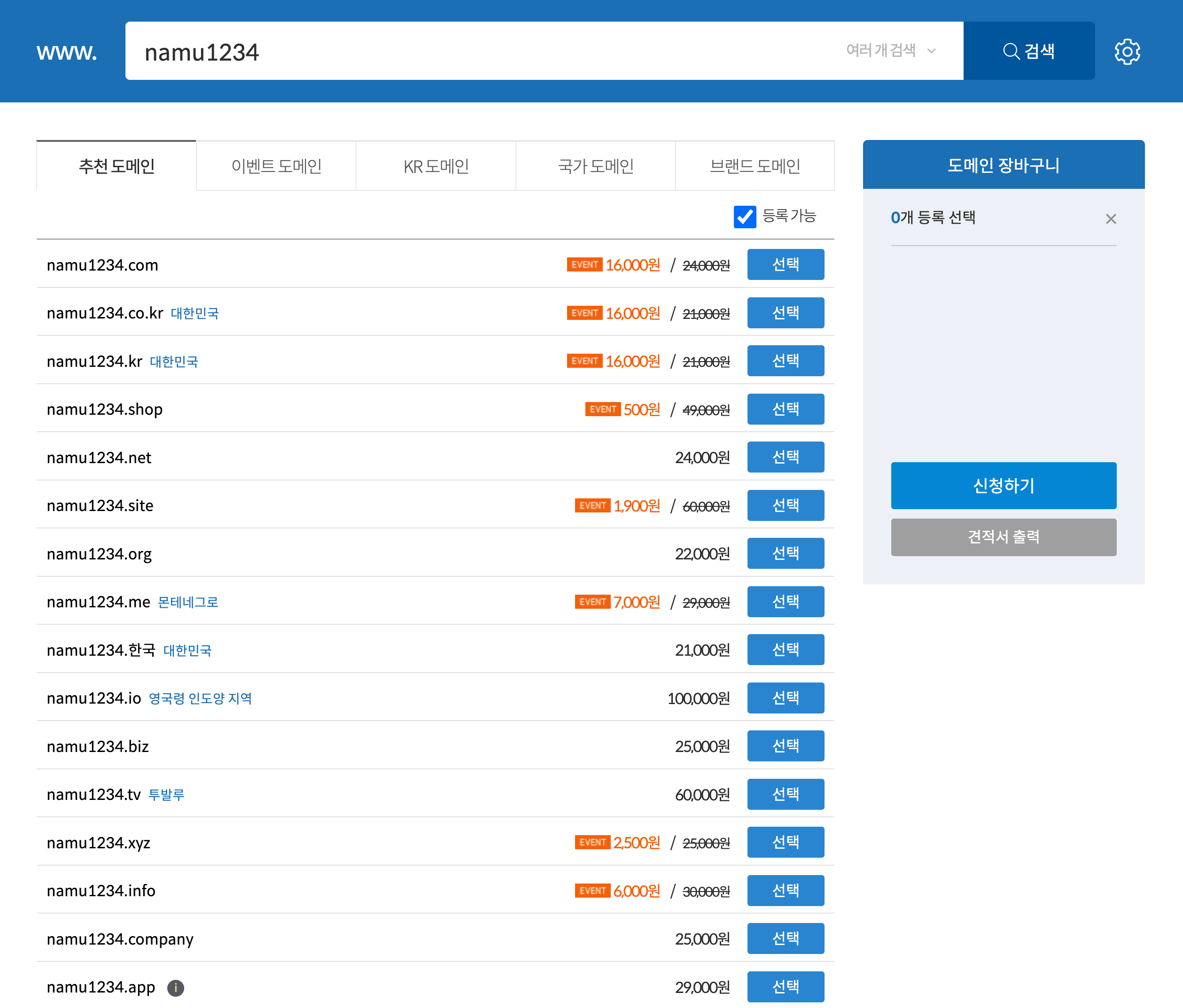 4. 입력한 주소에 사용 가능한 여러 형태의 도메인 주소가 가격과 함께 리스트업 되는데 기왕이면 글로벌한 도메인인 com으로 선택하기를 추천한다.