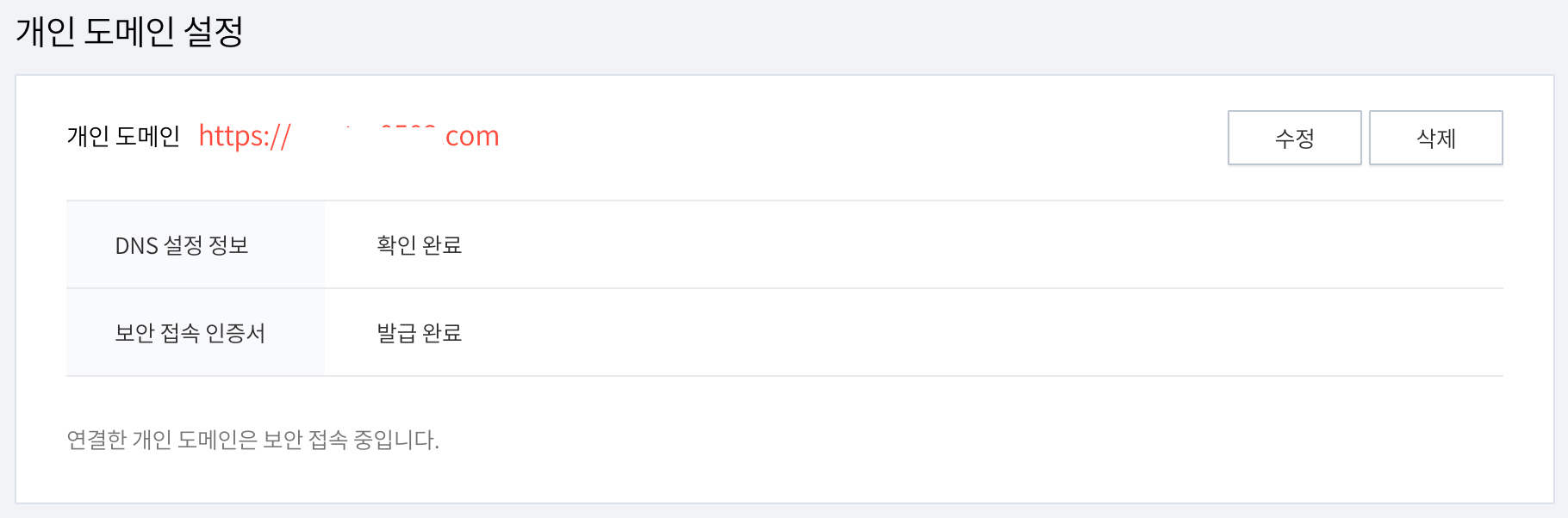 10. 가비아에서 구입한 도메인 주소를 입력하고 변경사항을 저장해주면 도메인이 서로 연결된 것을 확인할 수 있다.
