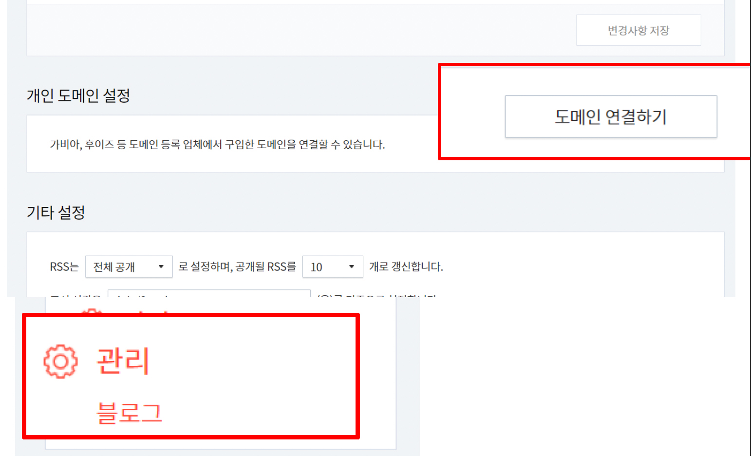 9. 왼쪽 사이드 바에 있는 관리의 하위 메뉴인 블로그를 클릭하고 그 창에서 도메인 연결하기를 찾아 클릭한다.