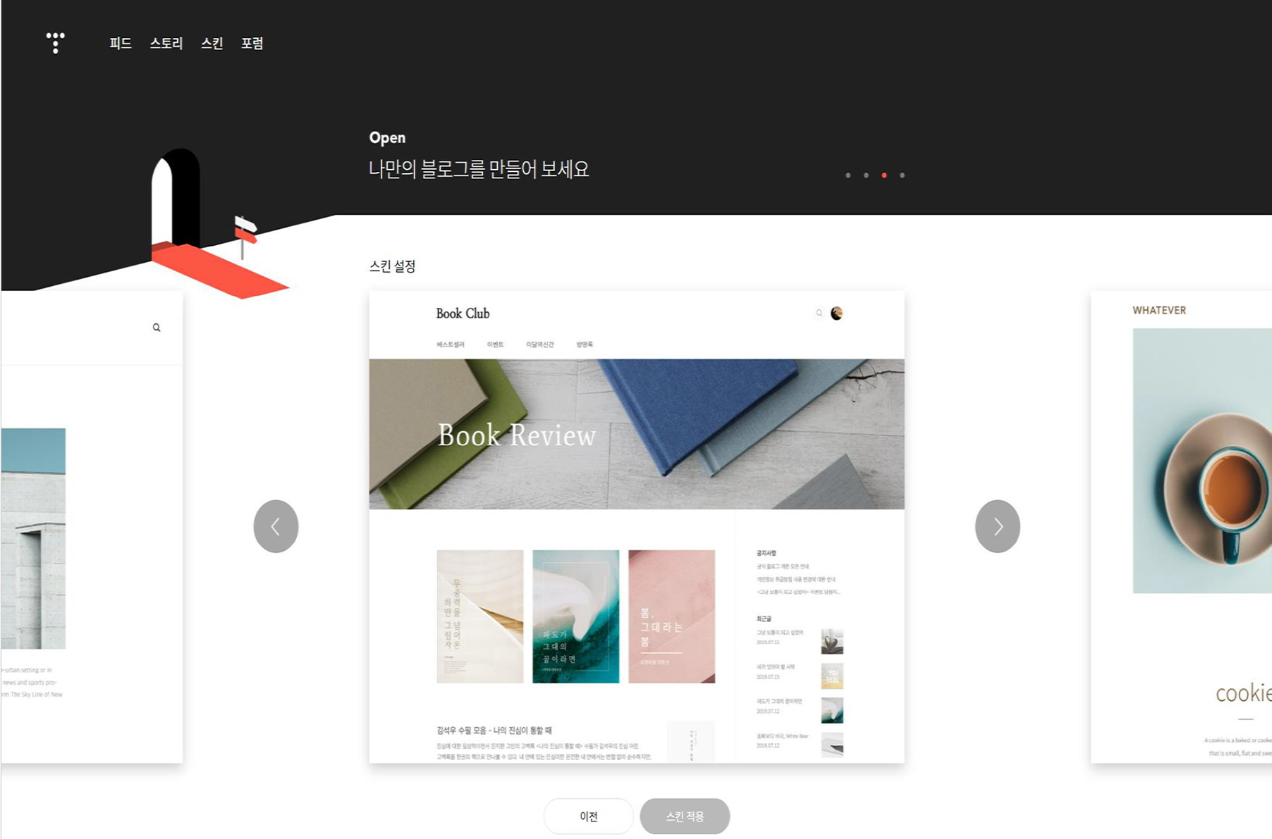 5. 정보를 입력하고 나면 스킨을 선택하게 된다. 만약 이 티스토리를 개인적인 용도로 사용한다면 스킨을 취향껏 선택해도 좋지만 광고 게재가 목적이라면 최대한 심플한것이 좋다. 클릭했을때 가볍게 열려야 많은 사람들의 진입이 쉽기 때문이다. 참고로 광고용 블로그 강사들이 권하는 스킨은 'Book Clip'이다. PC로 블로그에 접근하는 사람들이 점점 줄어들다 보니 예전처럼 스킨의 중요성이 약해지는 분위기다.