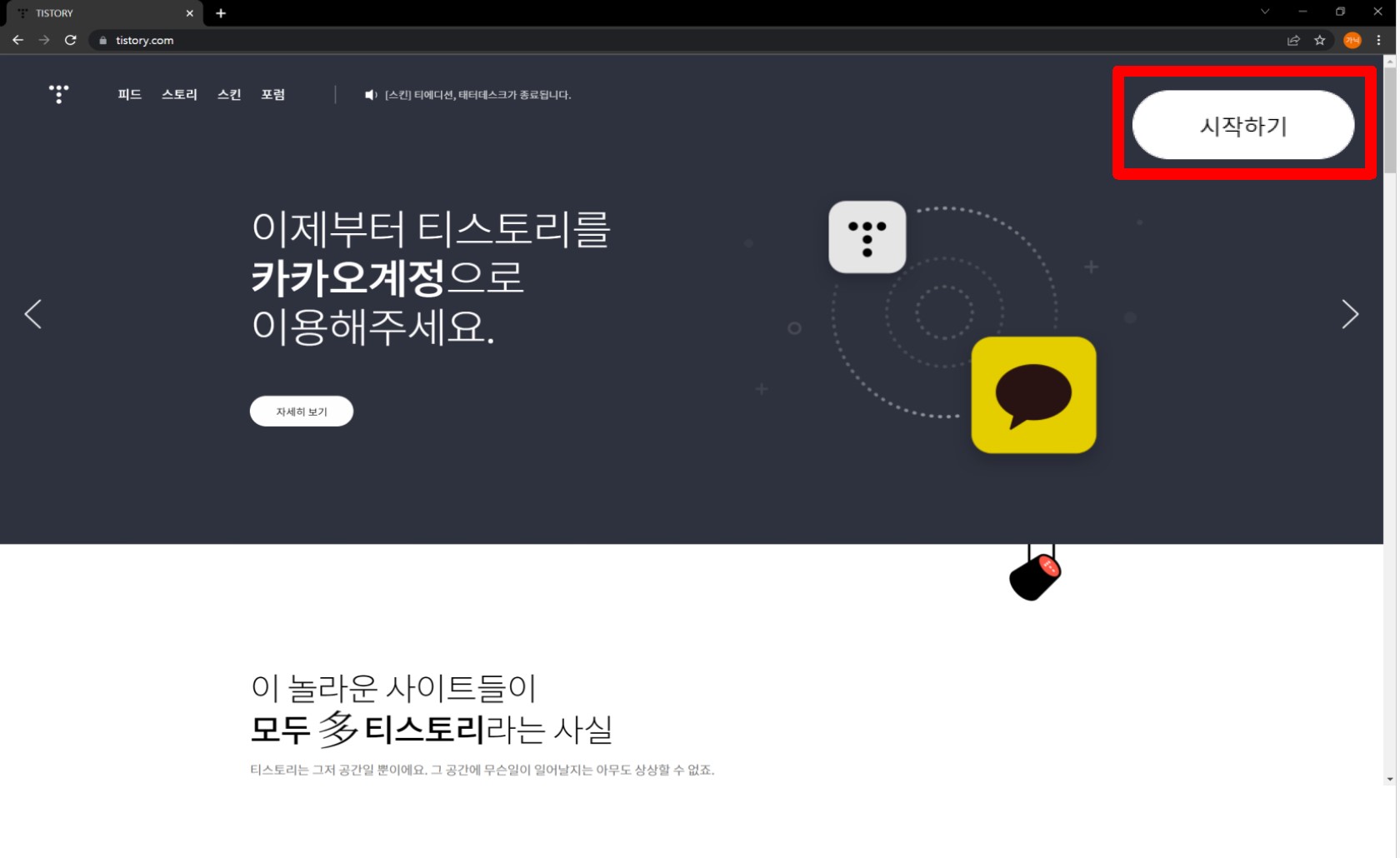 1. 크롬 검색창에 티스토리를 검색해서 홈페이지로 들어간 후 메인화면 오른쪽 상단에 있는 '시작하기' 버튼을 누른다.