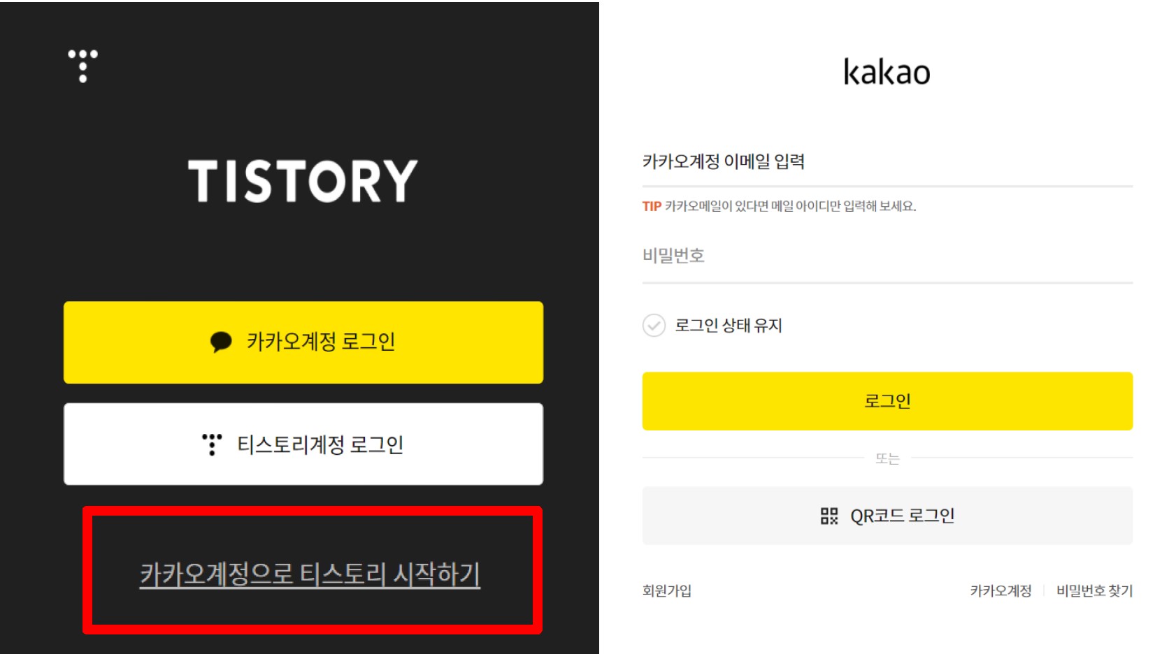 2. 카카오 계정으로 티스토리 시작하기 버튼을 누르면 자신의 카카오 계정정보 입력창이 나온다.