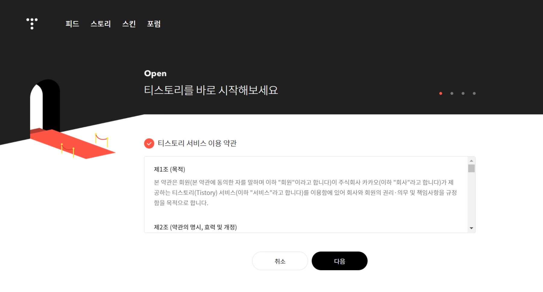 3. '티스토리를 바로 시작해보세요'라는 화면이 나오면 이용약관에 체크 하고 다음버튼 꾸욱.