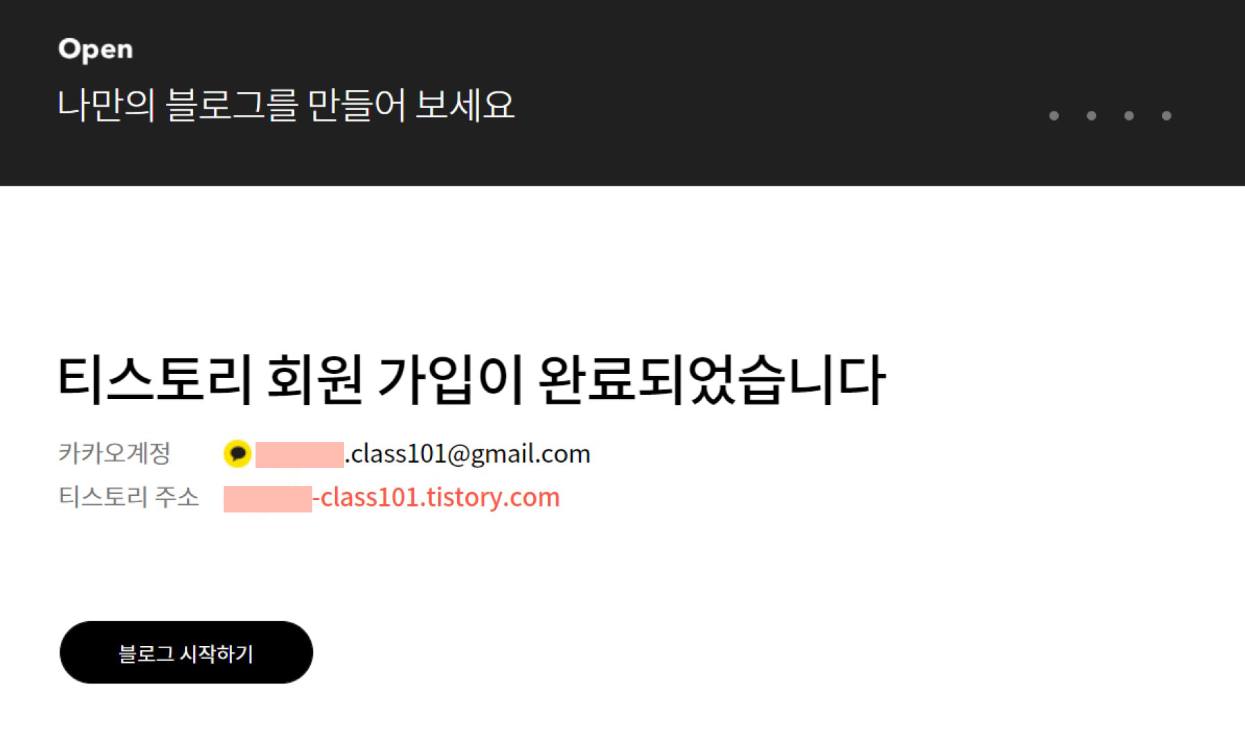 2. 카카오 계정으로 티스토리 시작하기 버튼을 누르면 자신의 카카오 계정정보 입력창이 나온다.
