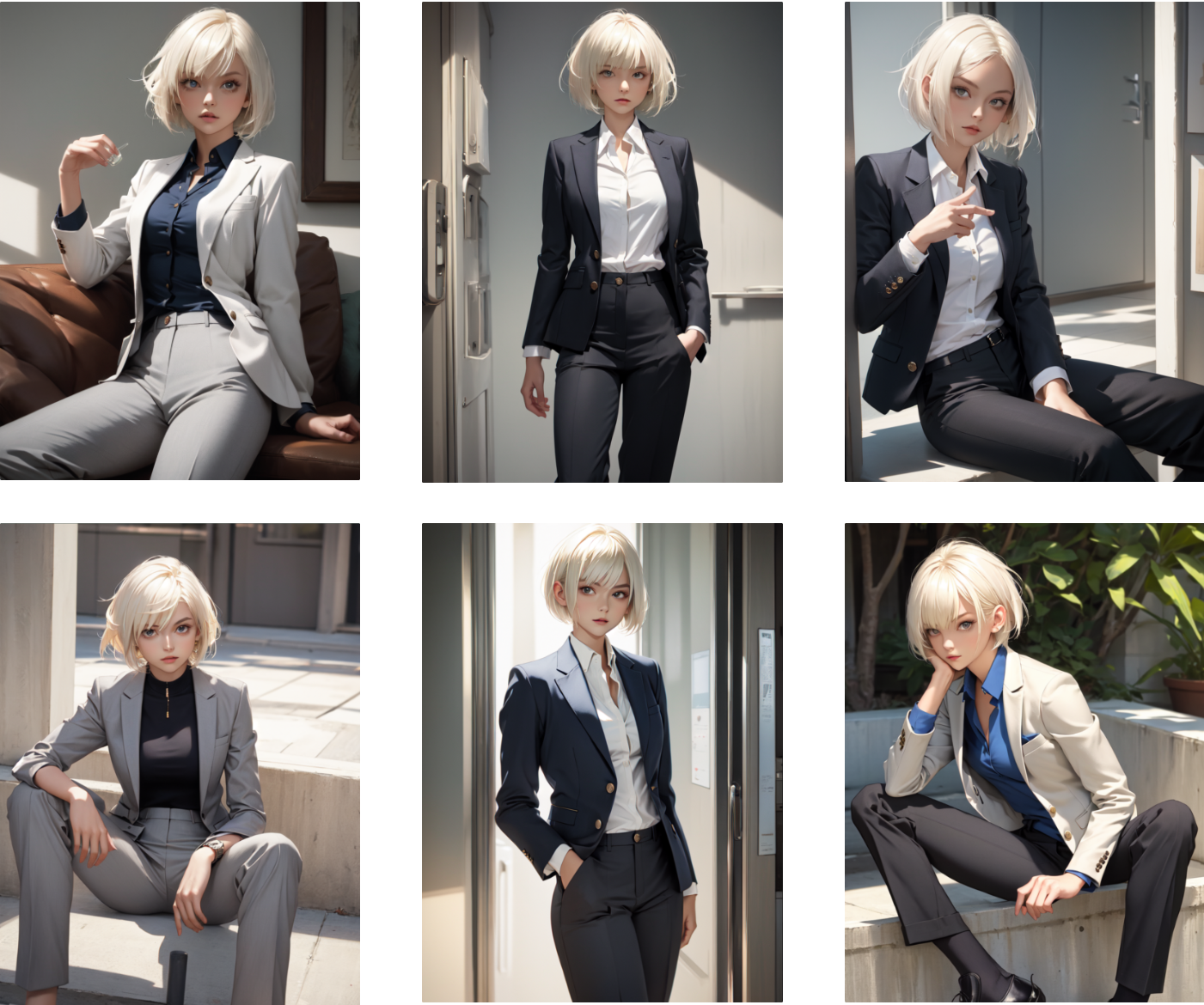 프롬프트 masterpiece, best quality, 1girl, short hair, platinum blonde hair, blazer, shirt, trousers, relaxed