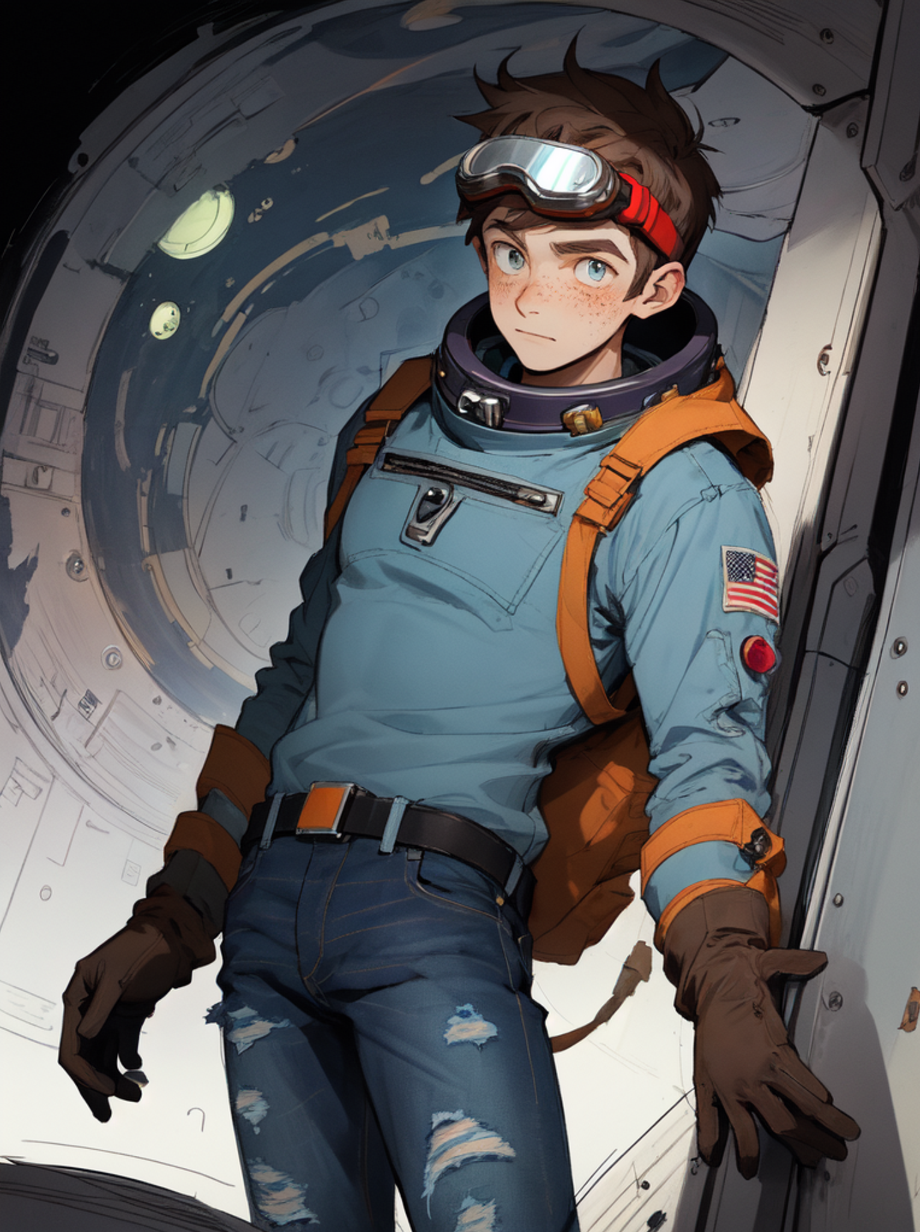 프롬프트 (sketch:1.1), (masterpiece, best quality), 1boy, spacepunk engineer, science fiction, distressed jeans, freckles, gloves, goggles