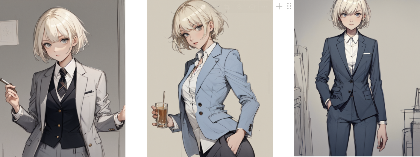 프롬프트 (sketch:1.1), masterpiece, best quality, 1girl, short hair, platinum blonde hair, blazer, shirt, trousers, relaxed
