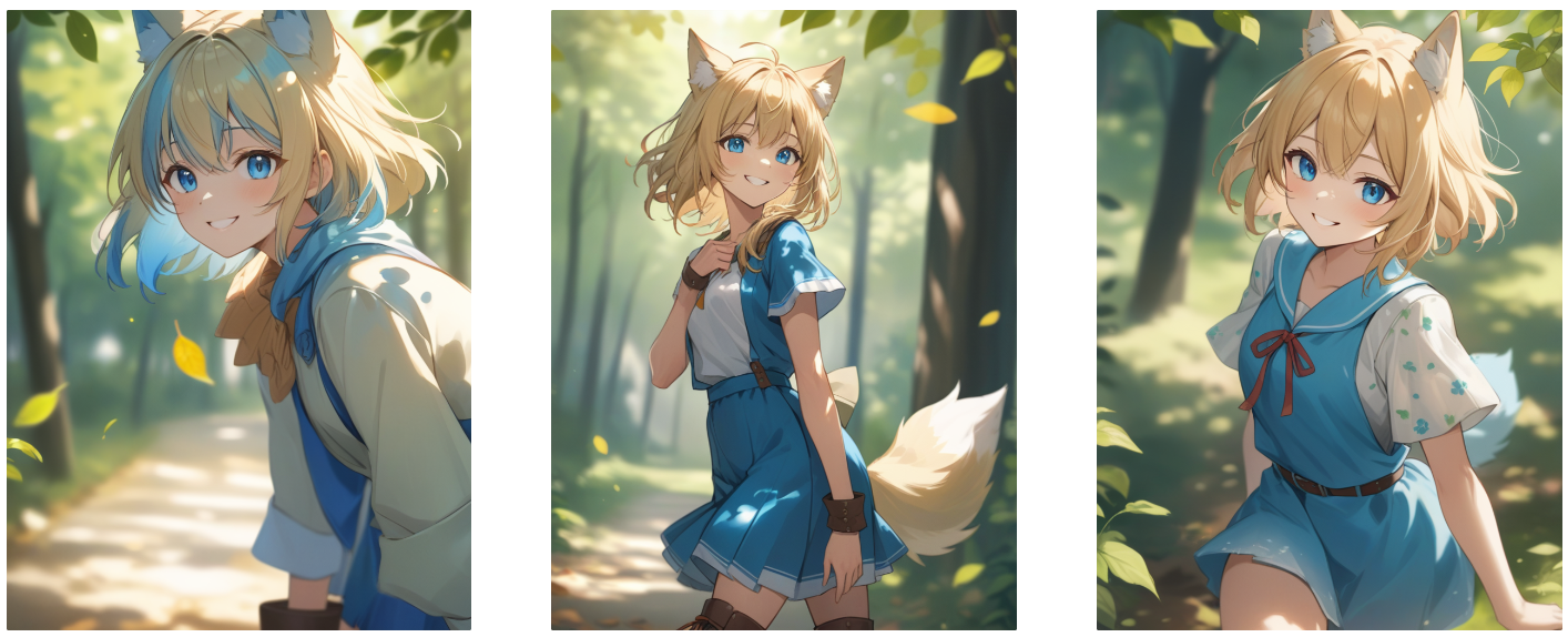 귀엽고 사랑스럽다라는 특징은 모델에 세팅된 느낌 그대로 구현이 되지만 스타일이나 포즈, 표정, 컬러값 등을 교체하면서 미묘하게 달라지는 결과 값을 확인할 수 있다. 스테이블디퓨전을 처음 시작할때는 마음에 드는 샘플로 기본 값을 두고 여러 스타일을 적용해보며 익숙해지는 방법이 좋을듯 하다.