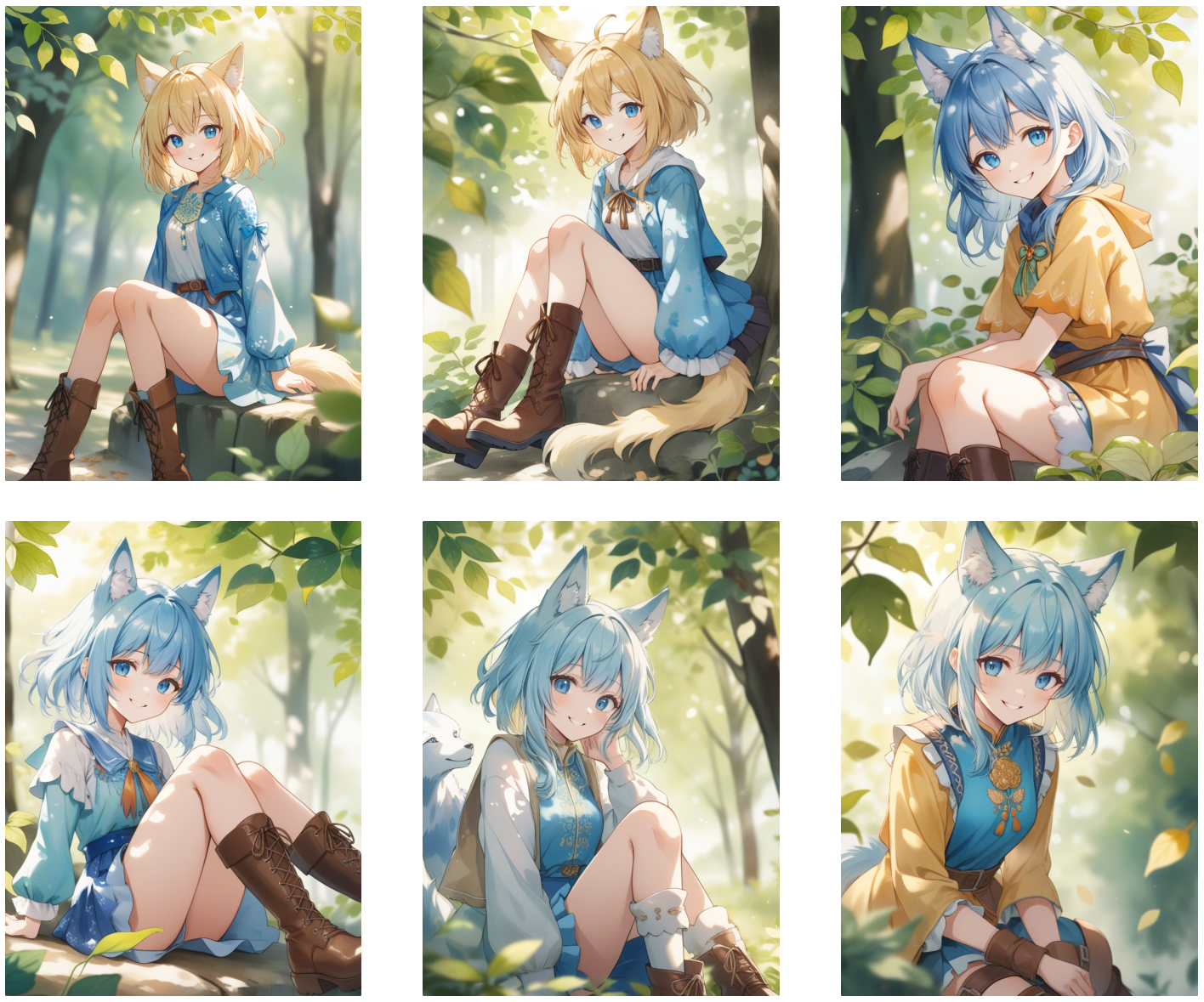 An anime style wolf girl, short blue hair, blue eyes, wearing bright clothes and smiling, ground,blonde hair,(dappled sunlight)+,blurry,depth of field, boots,leaf, lora:detail:0.6
