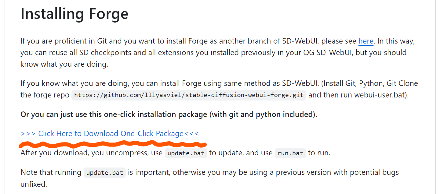 AUTOMATIC1111을 설치할 때는 최소한으로 갖춰야 할 pc환경부터 설명했는데 이번 설치는 일반 유저들을 위한 버젼이므로 매우 간단하다. 일단 아래 링크로 가서 Installing Forge 항목이 나올때까지 스크롤을 내린다. 이미지에 체크 된 부분을 클릭하여 SD Forge 팩케지 폴더를 다운 받는다.