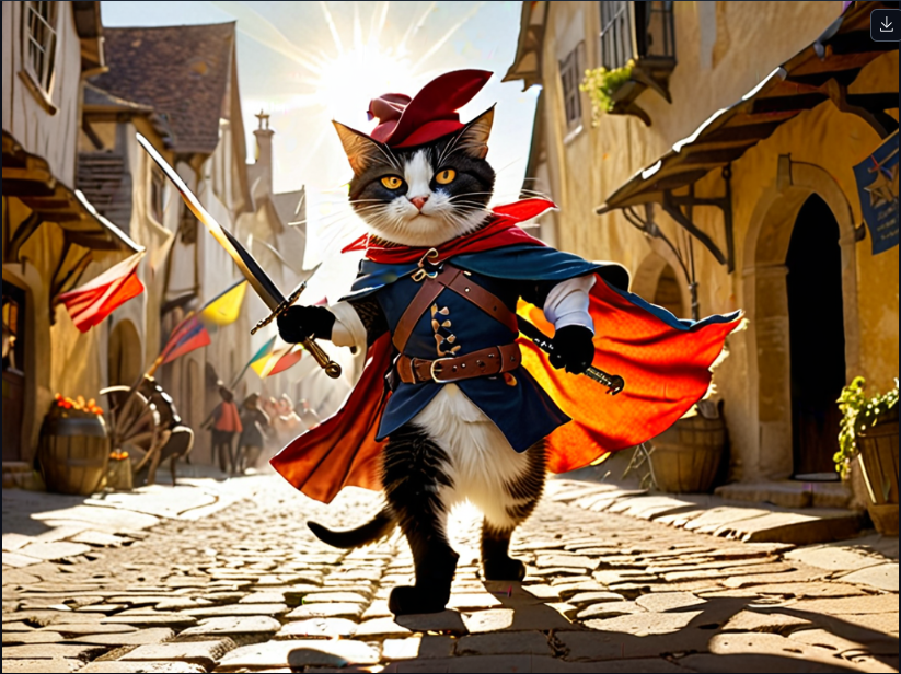 juggernautXL_v9Rdphoto2Lightning.safetensors라는 체크포인트 모델의 기본 세팅값이 적용되었고 프롬프트 자체에도 지브리스타일에 대한 언급이 빠져있어서 이미지가 키워드에 충실하진 않은 반면, 장화신은 고양이를 중세시대에 활약하는 용감한 무사로 설정하여 재미있는 이미지를 만들어 주었다.