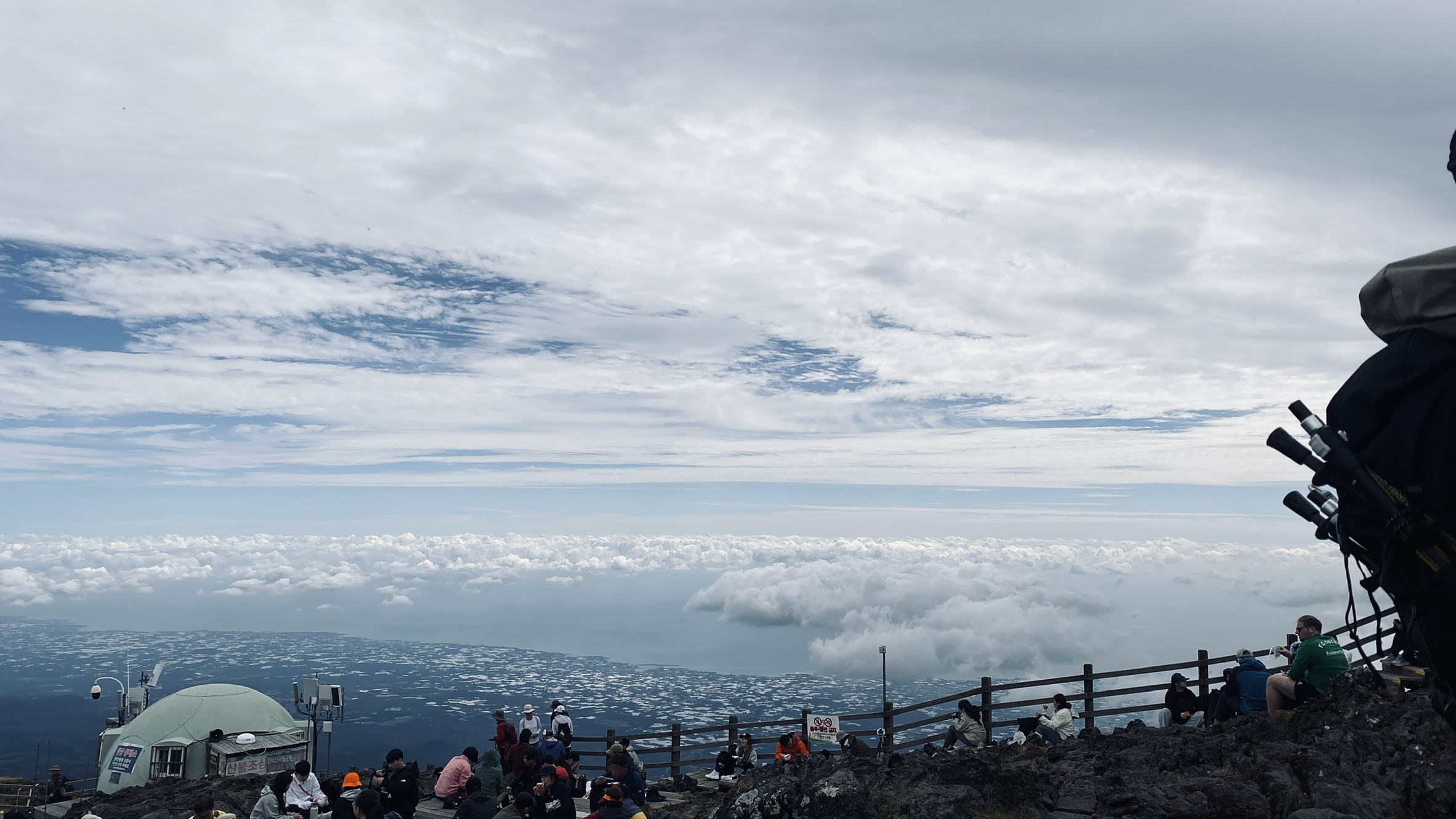 속밭 휴게소를 지나 4~50분쯤 오르다 보면 샘터가 나오는데 거기에서 사라오름으로 오르는 길이 있다. 꽤 오랫동안 완만한 경사의 등산을 계속하다가 그 전 후 즈음부터 가파른 코스가 진행되는 느낌이다. 하지만 돌이 많은 것 말고 한라산은 꽤나 오르기 쉬운 산이다...라고 생각하며 진달래 휴게소에서 점심을 먹었다. 오르는 동안에는 정상에서 점심을 먹자 했는데 일행들이 있어 좀 지체가 된 탓에 다들 허기가 졌나보다. 남은 구간은 생각보다 어렵지 않은 코스라는 누군가의 말에 긴장을 좀 풀어버린건지... 실제 오르는 길이 험하기 보다 체력이 딸려서였는지 호흡이 가빠서 매우 고생하며 올랐다. 이미 엄청나게 많은 사람들이 자리를 잡고 식사를 하거나 인증샷을 위해 줄을 서 있는 중이었다.