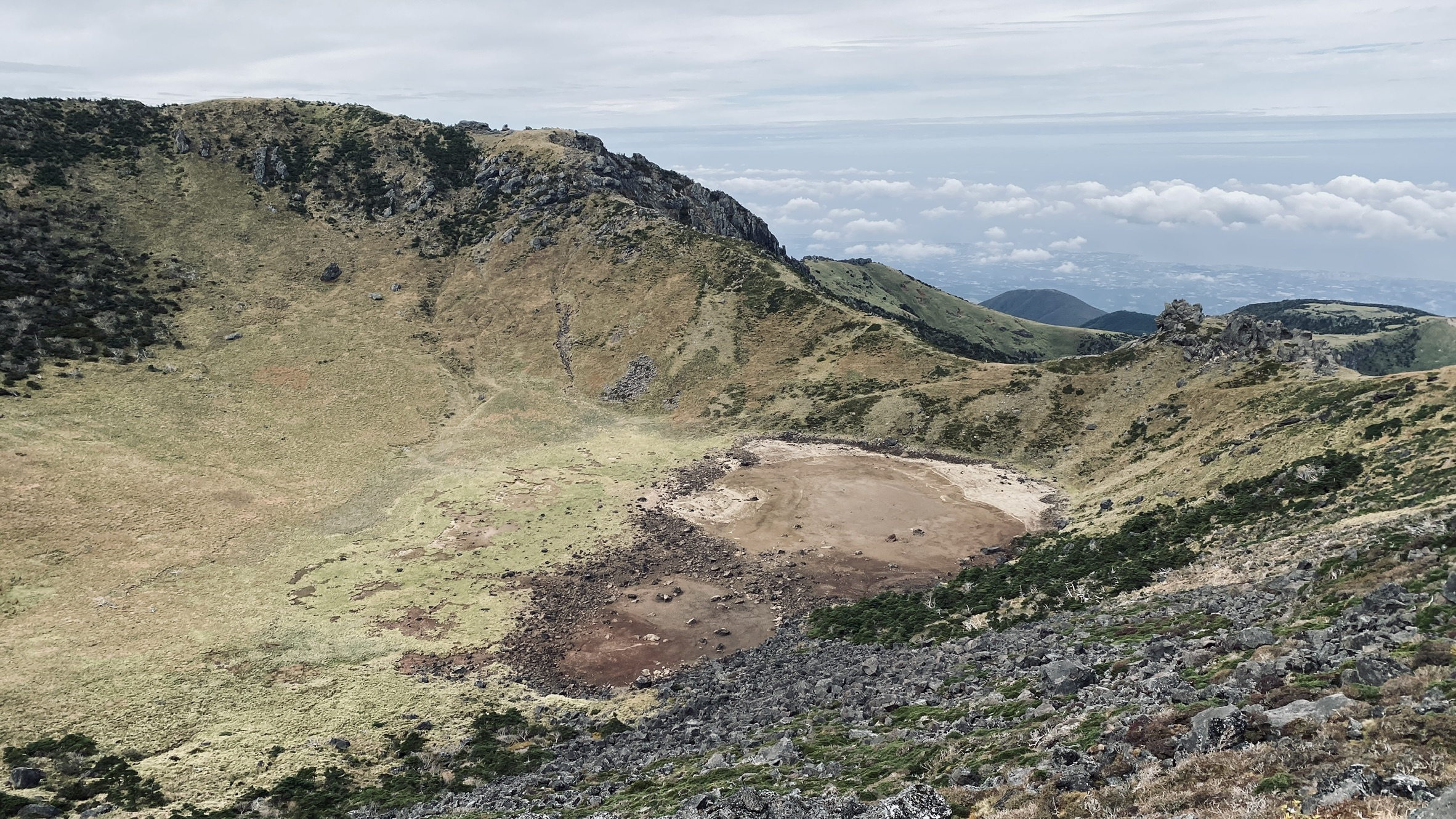 이틀 내내 비가 왔던 후여서 또 비가오면 어쩌나 했는데 다행히도 백록담이 모두 보이는 맑은 날씨였다. 일행 중 한 사람은 세번째 도전만에 백록담을 보았다며 좋아했다. 그런데 백록담이... 어째 내가 생각하던 그 모습이 아니었다. 흰색 사슴이야 전설이라치고 호수는 어디있냐고오~ 그런 줄 알았으면서, 사실 호수는 둘째치고 백록담이라도 볼 수 있다면 하면서 올라왔는데도 좀 아쉬웠다. 그래도 우리가족 전원 예외없이 모두 정상 완주하였으니 박쑤~!!