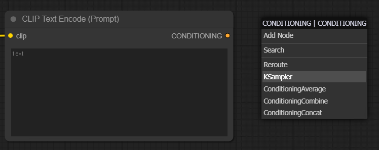 CLIP Text Encode(Prompt) 오른쪽 옆에는 하나의 아웃풋 포인트인 CONDITIONING이 있다. 2번과 동일하게 포인트를 클릭한체 빈 화면에 놓으면 뜨는 리스트 중 KSampler를 선택 해 생성해준다.
