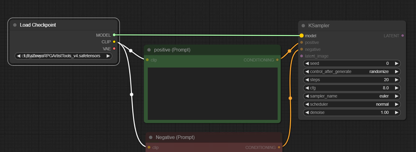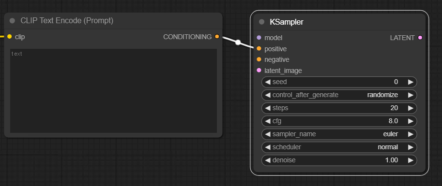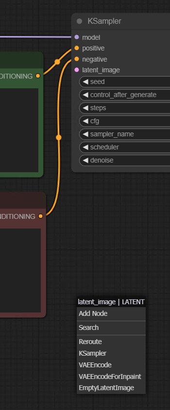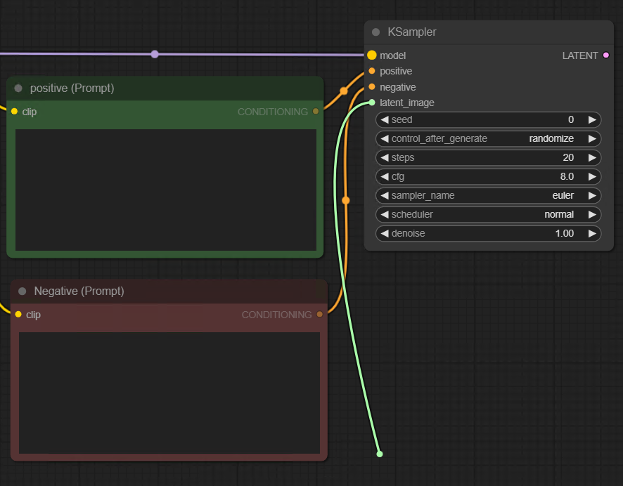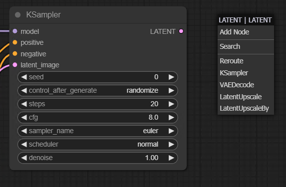 KSampler 상단에 model 인풋포인트는 맨 처음 생성했던 Load Checkpoint의 아웃풋과 연결하면 된다. 자세히 보면 연결 가능한 인풋과 아웃풋 포인트는 컬러가 같고 서로 연결이 불가능한 컬러는 색이 흐릿해지면서 비활성화 되도록 사용자의 편의성을 고려해놓은걸 알 수 있다.