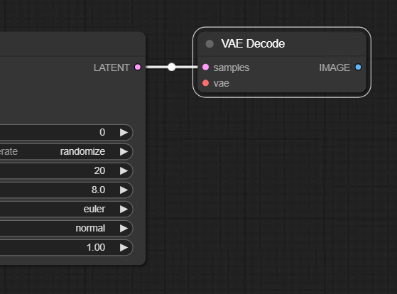 이제 KSampler 노드에서 인풋인 Latent image 노드와 아웃풋 LATENT를 연결하면 된다. 먼저 인풋 연결점을 클릭한 체 빈 화면에 놓으면 생기는 리스트에서 Empty Latent Image를 생성해준다. 오른쪽 아웃풋 연결점을 클릭하여 같은 방법으로 VAE Decode 노드도 생성해준다. 그리고 Load Checkpoint의 남은 아웃풋 vae와 VAE Decode의 인풋 vae를 연결해준다.