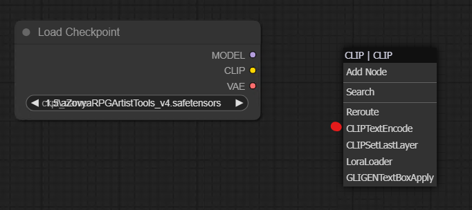 그 다음엔 어떤 노드를 추가해야할지 고민될 수도 있다. 그럴 땐 노드 오른쪽에 있는 아웃풋 포인트 중 하나를 클릭한채 바닥에 놓으면 연결할 수 있는 노드 리스트만 열려서 더 쉽게 생성하고 연결할 수 있다. 우린 두번째로 CLIP Text Encode(Prompt)를 추가한다. WebUI에서 프롬프트를 적는 곳과 동일한 역할을 하는 노드이다.