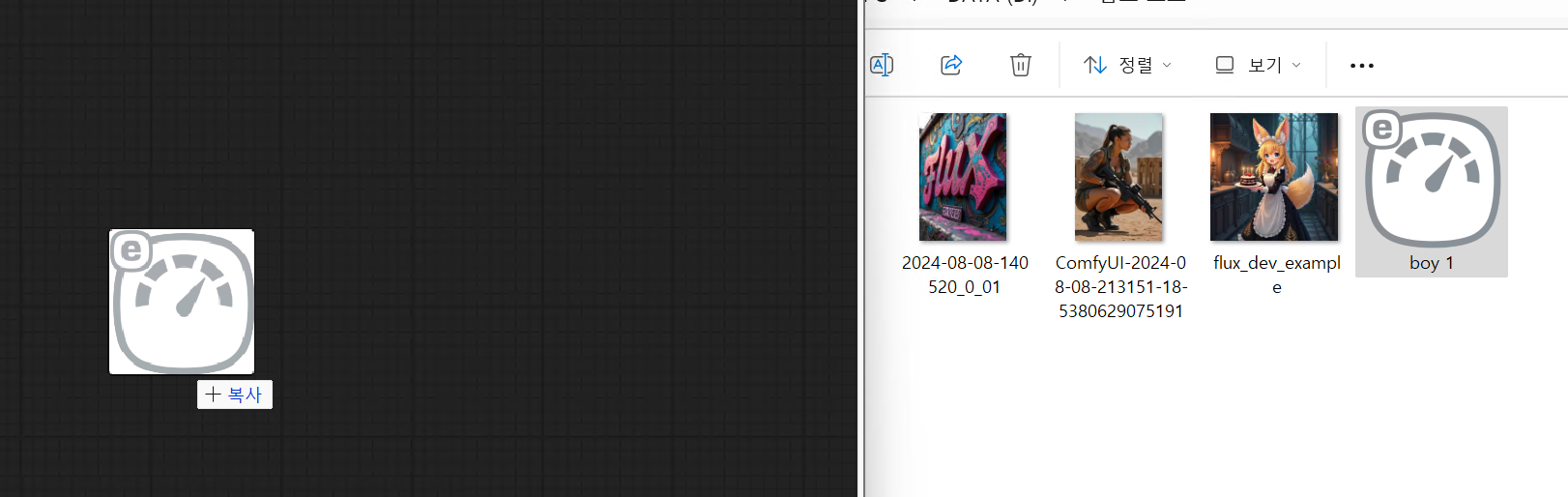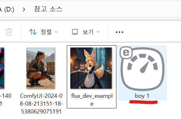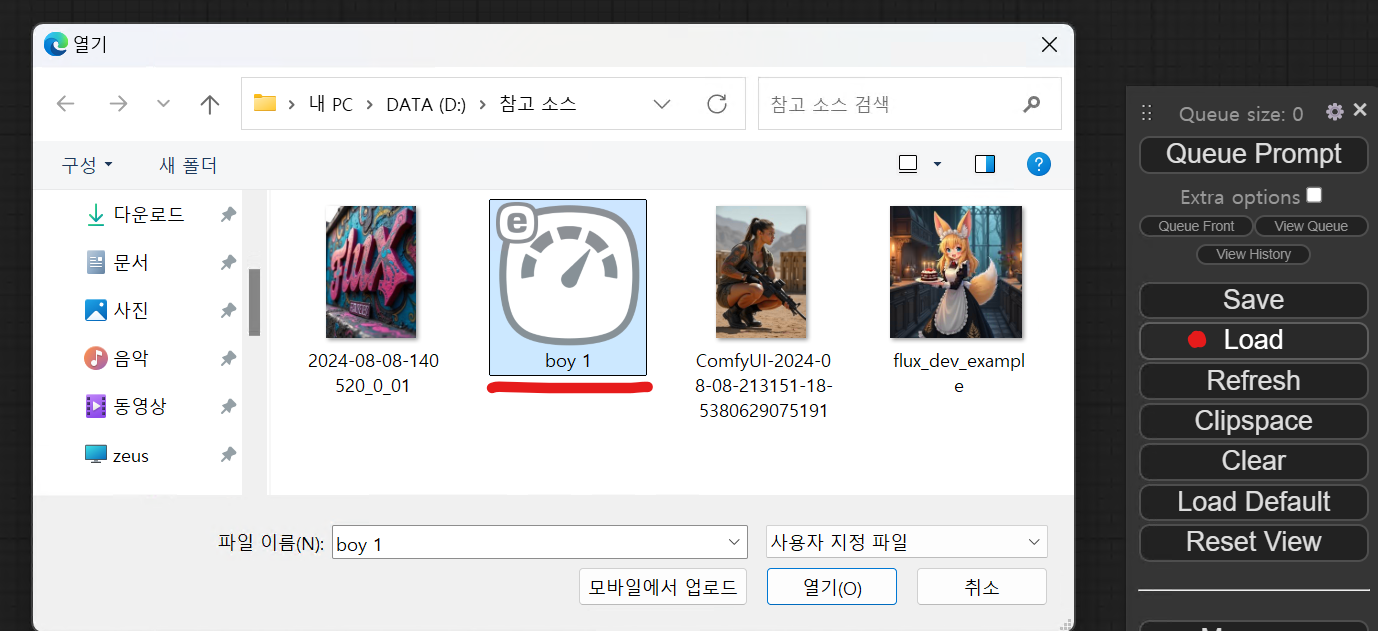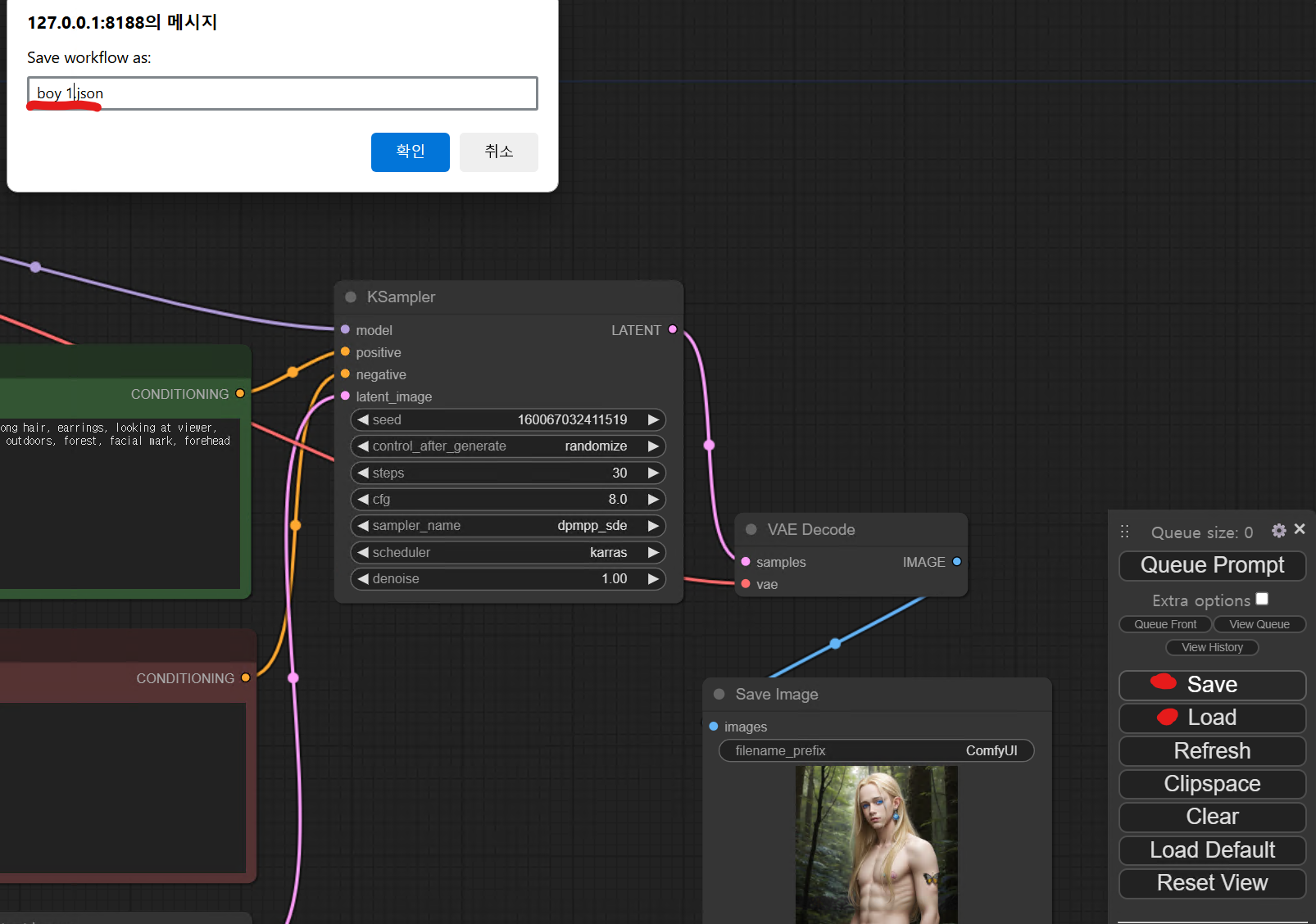 이제 오른쪽에 있는 메뉴패널의 save 버튼을 눌러서 파일을 잘 저장해두었다가 lode 버튼을 눌러 오픈해 사용해도 되고 나중에 저장된 json 파일을 화면에 드래그해서 놓아도 사용 가능하다. 설정값과 프롬프트 등 모든 속성을 그대로 가져온다. 스테이블디퓨전에서  생성한 이미지를 화면에 드래그해 놓아도 생성할때 사용했던 노드와 옵션을 그대로 불러올 수 있어서 처음 시작하는 사람들은 파일을 드래그해놓고 시작하는 방법도 나쁘지 않다. 다만 커스텀노드를 활용한 난이도 높은 워크플로우일 가능성이 커서 겁에 질릴수도 있다는 단점이. ㅎㅎㅎ