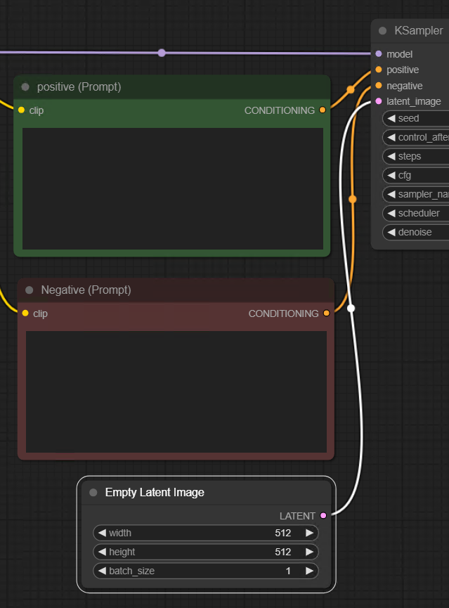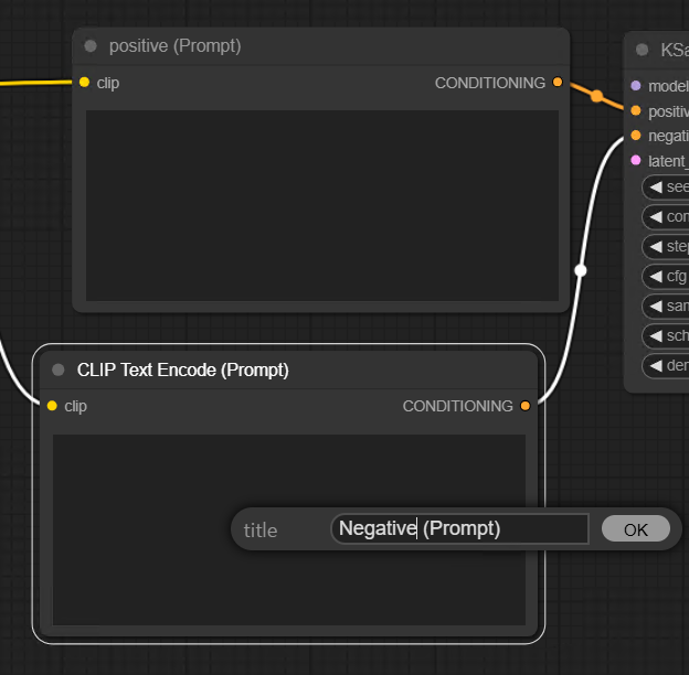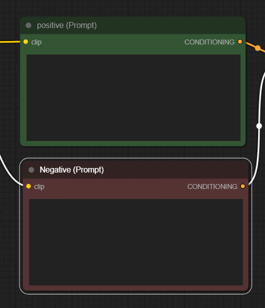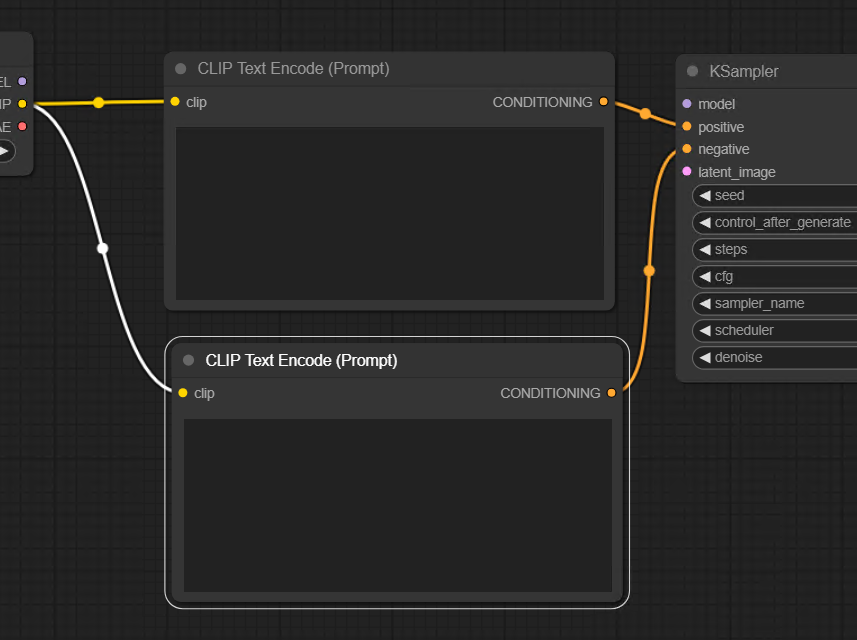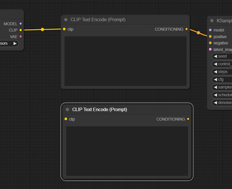 프롬프트는 긍정과 부정이 필요하므로 CLIP Text Encode(Prompt)를 하나 더 추가해보자. 복사해서 추가하려면 Alt버튼을 누른체로 CLIP Text Encode(Prompt)노드를 드래그한다. 또 다른 방법은 Ctrl+C, Ctrl+V가 있다. 그리고 또 다른 방법은 Ctrl+C, Ctrl+Shift V를 해서 붙이는 방법이다. 마지막 방법은 입력라인이 자동 연결된 상태로 복사되므로 가장 효율적인 방법일 수도 있겠다. 오른쪽  아웃풋 CONDITIONING은 KSampler의 negative에 수동으로 연결해준다.