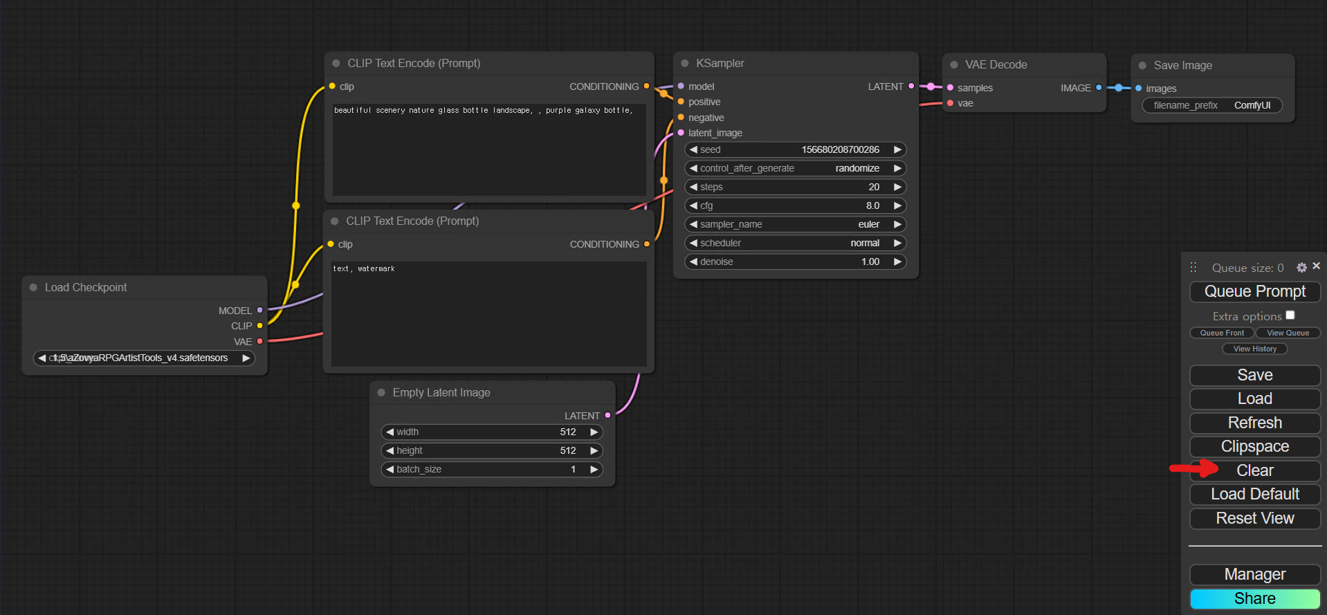 모델은 SDXL dreamshaper_8로 선택하고 사이즈는 512X768, steps는 30, sampler_name은 dpmpp_sde, scheduler은 karras로 입력하고 seed값은 0으로  입력한 뒤 Queue Prompt를 눌러본다. 생성이 문제 없이 되었다면 우리는 기본적인 워크플로우를 직접 만드는데 성공한것이다.
