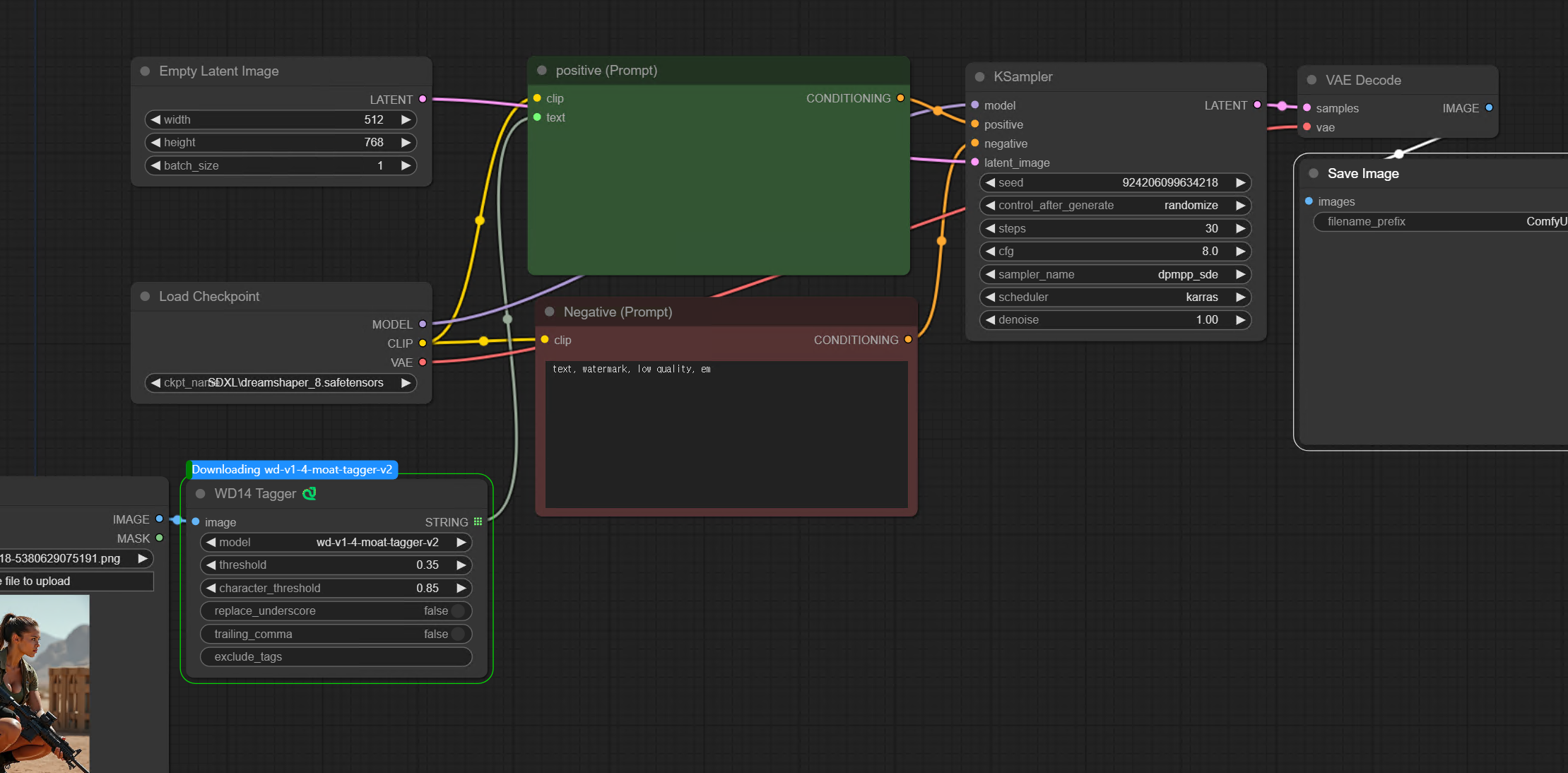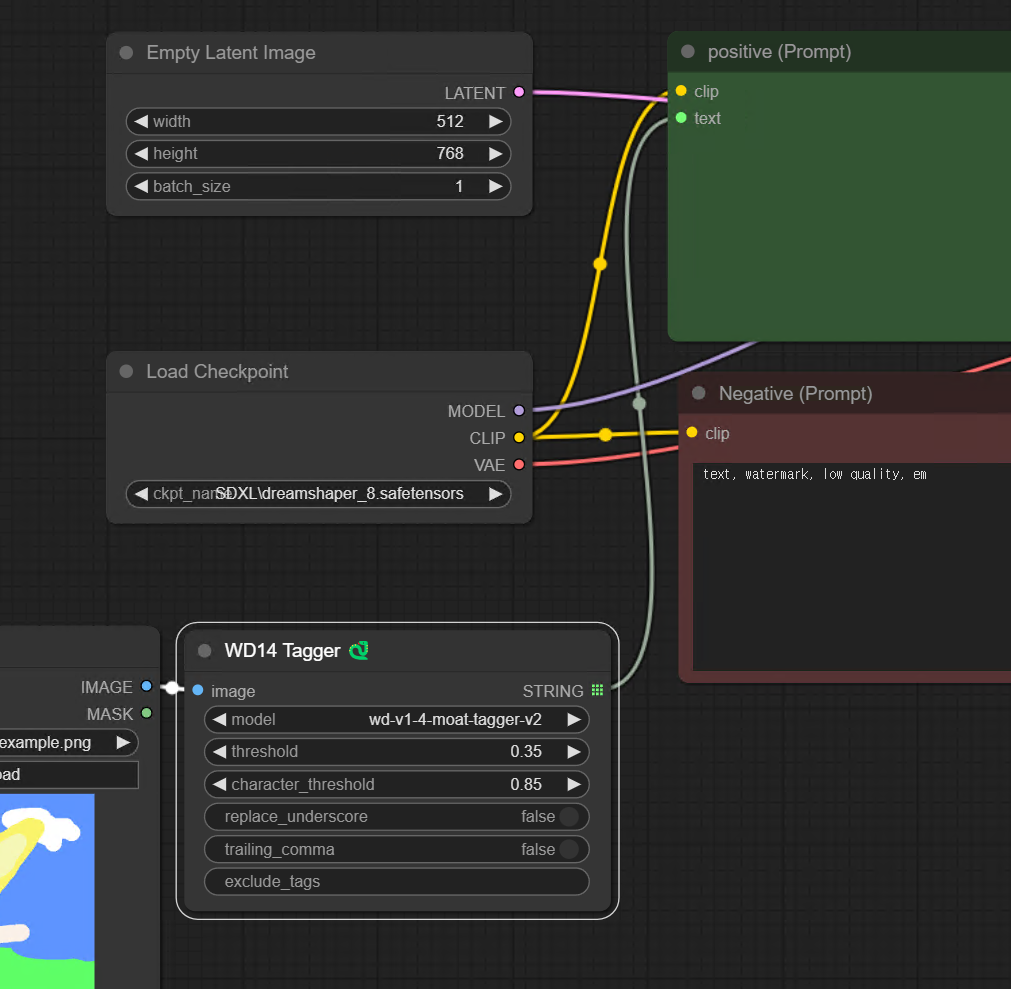 이제 이미지로 추출한 텍스트를 받기 위해 Text 노드 우클릭 메뉴 중 Convert Widget to Input > Convert text to input를 차례대로 선택한다. 텍스트 입력 부분이 사라지고 대신 text라는 인풋 포인트가 생성된 것을 볼 수 있다. WD Tagger노드의 아웃풋 STRING을 프롬프트창에 생성된 text 인풋과 연결한다.