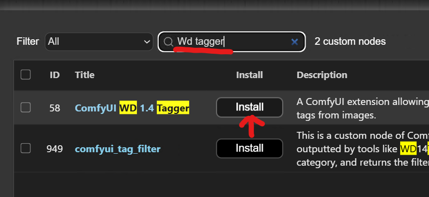 Manager을 열고 앞에 방법과 동일하게 서치바에 Custom node명을 입력하고 Install >> Restart 버튼을 눌러준다. WD Tagger는 이미지를 분석하여 텍스트로 바꿔주는 기능을 한다. 빈 화면을 더블클릭하면 나오는 창에서 Load Image를 설치해준다. 같은 방법으로 WD tagger 노드도 추가한 후 둘을 연결해준다.