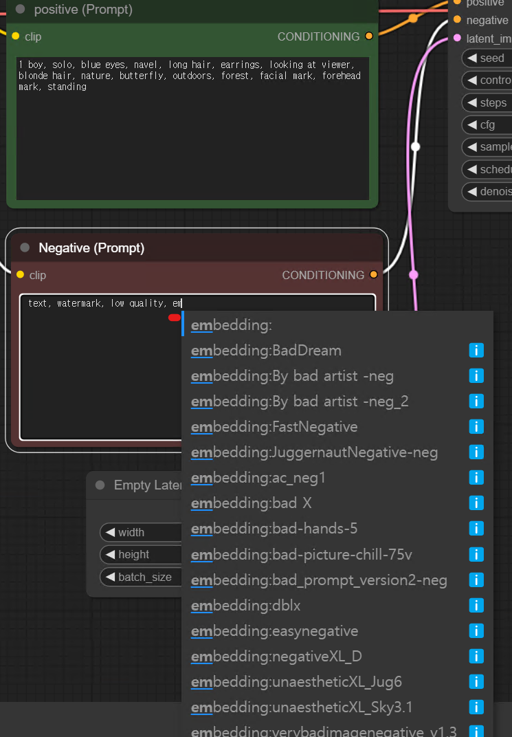 기능 1. CLIP Text Encode(prompt)에 임베딩을 입력할때 자동 완성을 도와준다. 임베딩의 앞부분만 입력해도 관련 임베딩 리스트를 보여주어 선택하면 자동 입력이 되므로 도움이 된다.