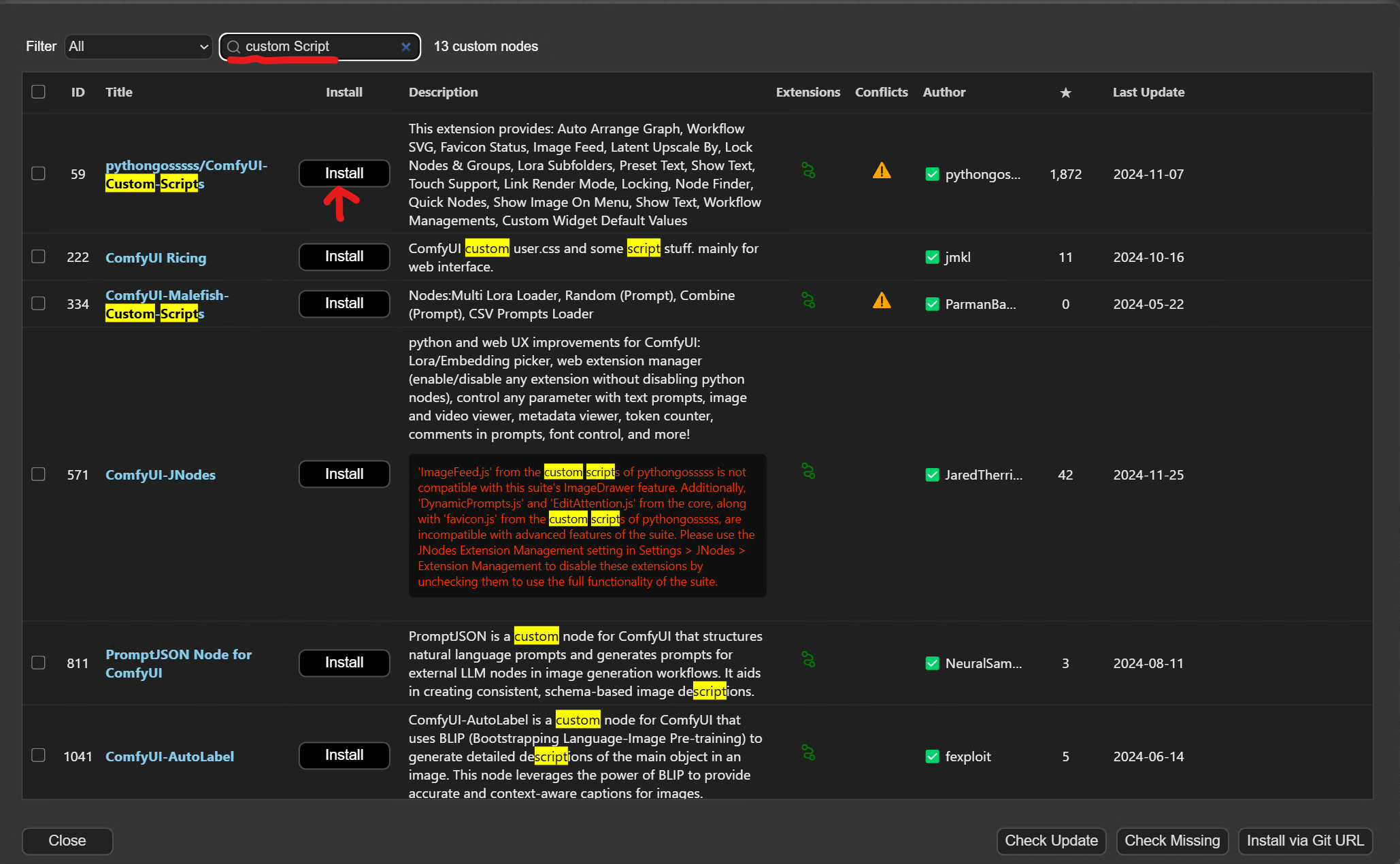 ComfyUI에는 매우 다양한 Custom Node들이 있다. Custom Node Manager 버튼을 눌러보면 설치 가능한 리스트가 보인다. 서치바 옆에는 설치할 수 있는 노드들이 1,654개가 있음을 알 수 있다. 이 중에서도 많은 워크플로우에 자주 사용된 Custom Node들을 우선으로 몇 개 설치해보자.