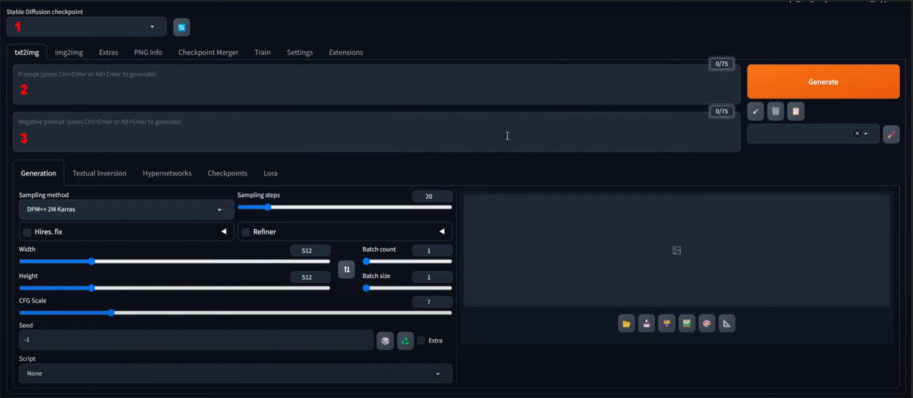 1번에서 체크포인트 모델을 선택할 수 있다. 체크포인트는 일반적인 이미지 혹은 특정한 장르의 이미지를 생성하기 위한 목적으로 미리 학습된 Stable Diffusion의 뇌 역할을 하는 모델이라고 생각하면 된다. 애니풍, 실사, 반실사 등 어떤 모델을 사용하느냐에 따라서 그림의 전체적인 스타일이 바뀌게 된다. 지금은 기본 한개만 설치되어 있어서 프롬프트를 넣어 이미지 생성을 하면 완성도가 떨어지는 것을 확인할 수 있다.