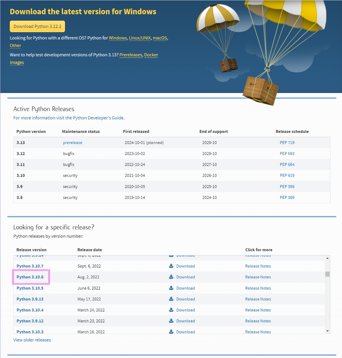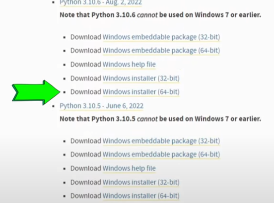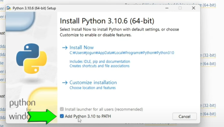 1. Python 설치 :다운로드 페이지에 접속, 3.10.6 버전을 다운받아 설치한다. 버전이 다르면 오류가 생기므로 꼭 확인 후 윈도우 인스톨러 64비트를 다운로드 한다. 인스톨 첫 화면 하단에 Add Python 3.10 path 체크박스를 꼭 체크 하고 다음 단계로 가야 함.